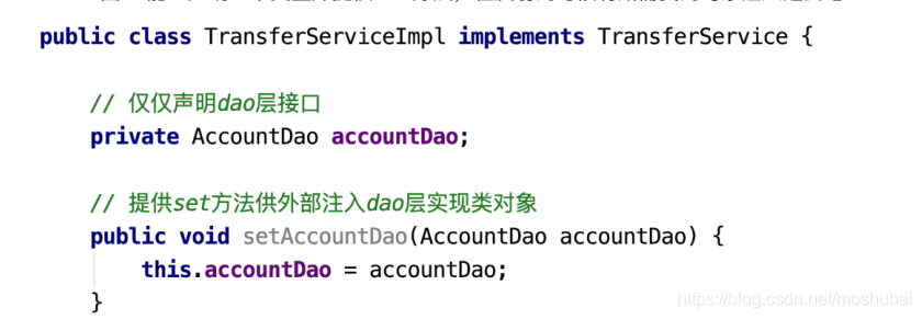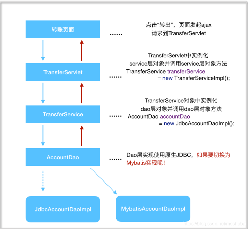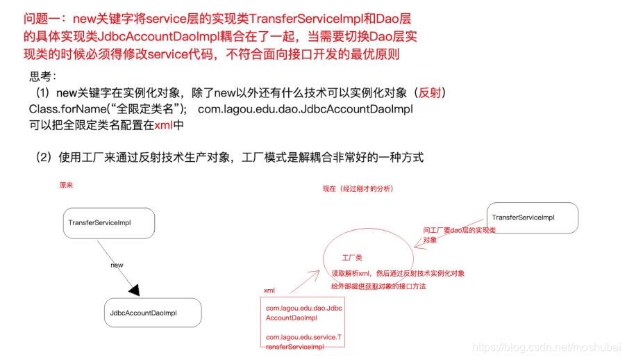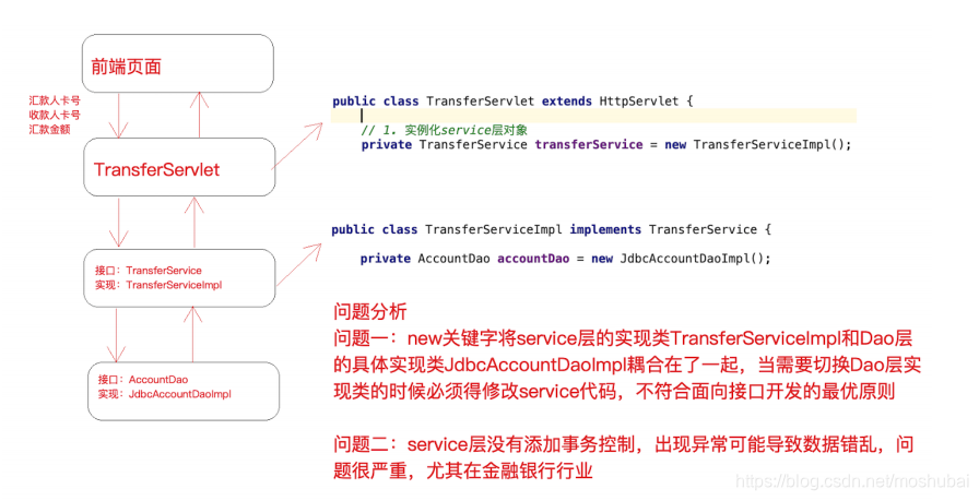 问题⼀:在上述案例实现中, service 层实现类在使⽤ dao 层对象时,直接在TransferServiceImpl 中通过